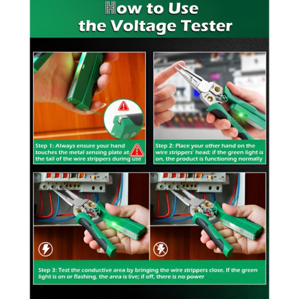 Покрива AWG 10, 12, 14, 18 и от 1,0 до 4,0 мм². Вграденият тестер ви позволява да потвърдите, че веригата не е под напрежение.