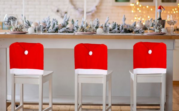 Коледните покривала за столове SANTASEAT са проектирани като покривала, наподобяващи шапки на Дядо Коледа,
