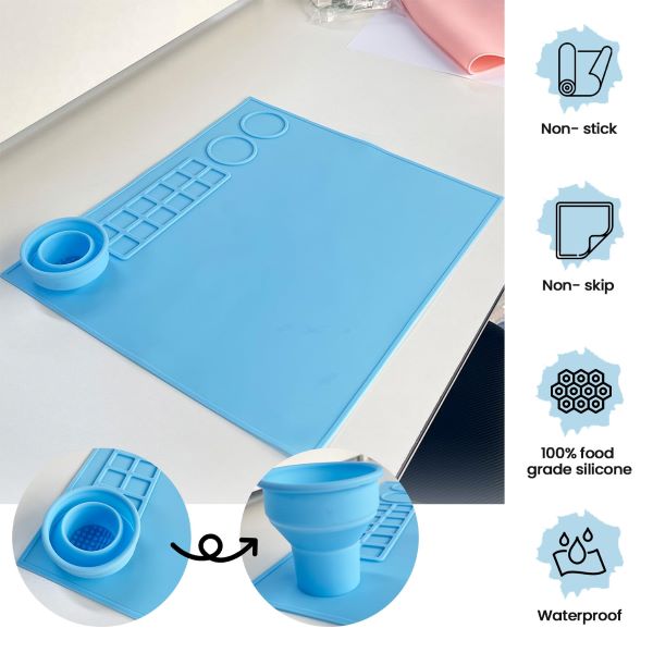 Изработена от 100% хранителен силикон, тази водоустойчива, незалепваща и нехлъзгаща се подложка е идеална за всички ваши занаятчийски нужди. С 14 отделения и зона за смесване, тя е идеална за организиране на вашите консумативи.