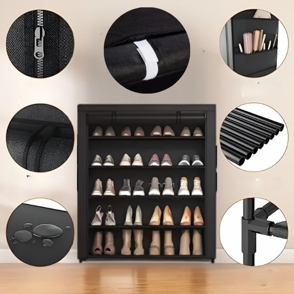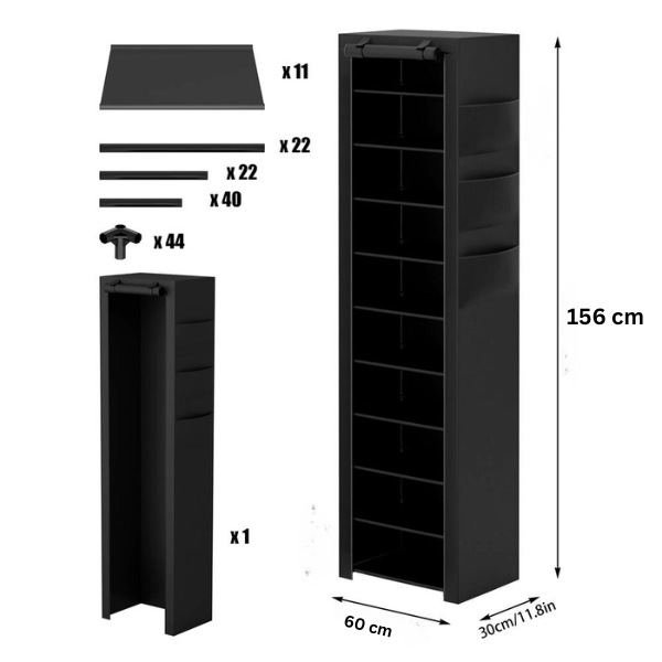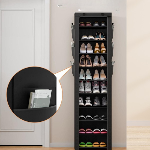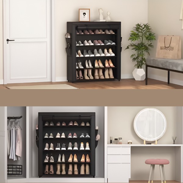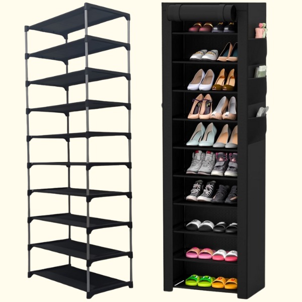 Оборудвана с платнено покривало, устойчиво на прах, и цип. Тази стойка за обувки гарантира, че обувките ви остават чисти, защитени от прах и мръсотия.