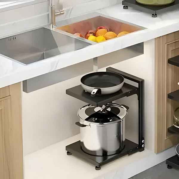 Този стелаж използва ефективно пространството в кухненските шкафове, като подобрява организацията и функционалността на кухнята.