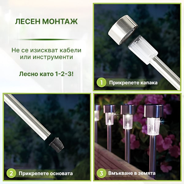 Насладете се на безпроблемно поставяне без нужда от окабеляване; просто ги забийте в земята и се насладете на мигновено осветление.